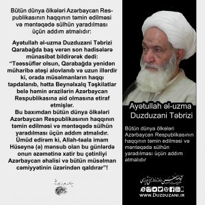 Bütün dünya ölkələri Azərbaycan Respublikasının haqqının təmin edilməsi və məntəqədə sülhün yaradılması üçün addım atmalıdır: Ayətullah əl-uzma Duzduzani Təbrizi Qarabağda baş verən son hadisələrə münasibət bildirərək dedi: “Təəssüflər olsun, Qarabağda…