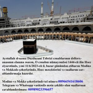 Həcc 1444-cü il nümayəndəsi Ayətullah əl-uzma Duzduzani Təbrizi cənablarının dəftərxanasının elanına əsasən, O cənabın nümayəndəsi 1444-cü ilin Həcc ziyarətində, yəni 11/6/2023-cü il, bazar günündən etibarən Mədinə və Məkkədə şəhərlərində, Həcc…