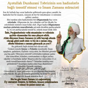 Ayətullah Duzduzani Təbrizinin son hadisələrlə bağlı təəssüf etməsi və İmam Zamana müraciəti Həzrət Ayətullah Duzduzani Təbrizi 21 oktyabr 2023-ci il Qum şəhərində fiqh dərsinin əvvəlində İslam dünyasında baş verən son…