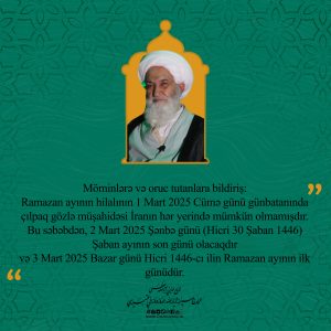 Ramazan ayının hilalının sübutu Hörmətli möminlərə və oruc tutanlara xəbər verir: Xəbərlərə görə, Ramazan ayının hilalını adi gözlə görmək, 02. 04. 2022-ci il şənbə günü gecə həzrət Ayətullahul-uzma Duzduzani Təbrizi…