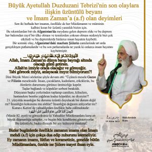 olaylara ilişkin üzüntülü beyanı ve İmam Zaman’a (a.f) olan deyimleri Büyük Ayetullah Duzduzani Tebrizi‘nin son olaylara ilişkin üzüntülü beyanı ve İmam Zaman’a (a.f) olan deyimleri Yüce otorite Büyük Ayetullah Duzduzani…